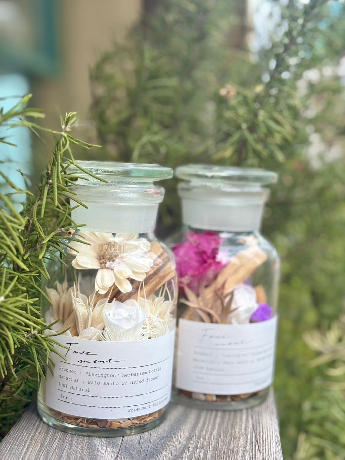 パロサントと色鮮やかなドライフラワーやプリザーブドフラワーをアレンジメントし、蓋を開けることで植物の香りも楽しめる観賞用商品です。